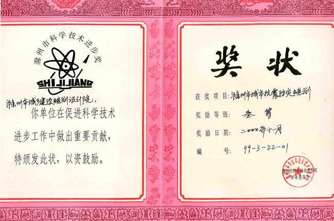 滁州市抗震防災規(guī)劃(科技進步三等獎).